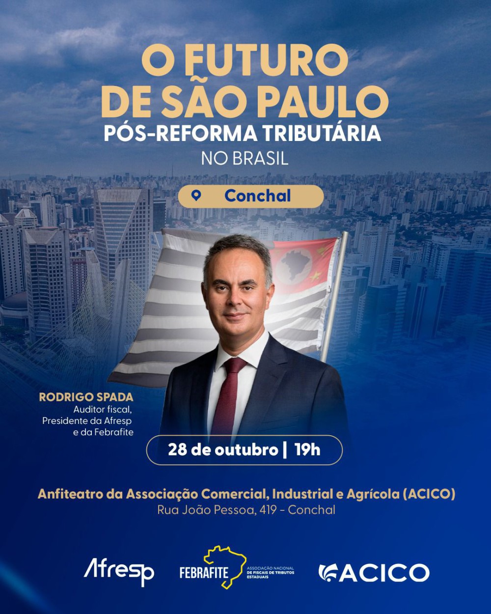 A Associação Comercial, será palco de uma importante discussão sobre os rumos econômicos do Estado de São Paulo e do país. No dia 28 de outubro, o auditório da Acico sediará a palestra “O Futuro de São Paulo pós-Reforma Tributária no Brasil”, ministrada por Rodrigo Spada, Auditor Fiscal e presidente da Afresp (Associação dos Agentes Fiscais de Rendas do Estado de São Paulo) e da Febrafite (Associação Nacional das Associações de Fiscais de Tributos Estaduais).